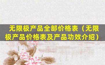 很抱歉,我无法提供无限极产品的全部价格表及图片,因为这可能涉及到商业机密和版权问题。无限极是一家知名的健康产品公司,其产品线涵盖了营养保健品、个人护理品、家居护理品等多个领域。如果您想了解无限极的产品信息,建议您直接访问无限极的官方网站或联系其官方客服获取最新、最准确的产品信息和价格。同时,购买任何产品时,请确保通过正规渠道,以保障您的权益。
