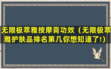 请注意,以上成分和功效是基于一般护肤产品可能包含的成分和它们的作用,具体到无限极萃雅活肤按摩膏的实际成分和功效,需要查看该产品的官方说明或成分列表。在使用任何护肤产品之前,建议先进行皮肤测试,以确保不会引起过敏反应,并且最好在使用前咨询皮肤科医生或专业美容师的建议。