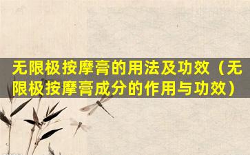 无限极是中国的一个品牌,主要生产健康食品和护肤品。关于无限极按摩膏的用法及功效,由于我无法获取最新的产品信息,以下提供的是一般按摩膏的通用用法和可能的功效,具体产品的使用方法和功效可能会有所不同,请以产品说明书或官方指导为准。