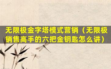 无限极是一家中国的直销公司,主要销售健康产品。在直销行业中,销售高手通常指的是那些能够有效推广产品、建立客户关系并实现销售目标的顶尖销售人员。以下是一些被认为是无限极销售高手可能使用的“六把金钥匙”: