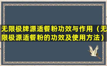 无限极源适餐粉是无限极公司生产的一款产品,根据产品说明,它主要含有多种植物蛋白、膳食纤维、维生素和矿物质等成分,旨在为消费者提供均衡的营养补充。关于该产品的具体功效和使用方法,建议您参考产品官方说明书或咨询专业医疗人员。