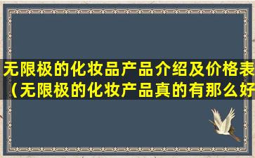 无限极(Infinitus)是一家中国的健康产品公司,隶属于李锦记健康产品集团。无限极提供多种健康食品、个人护理产品和化妆品。以下是一些无限极化妆品的产品介绍及价格表,但请注意,价格可能会因地区、促销活动和销售渠道的不同而有所变化。