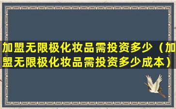 无限极(Infinitus)是一家中国的直销公司,主要销售健康产品、个人护理产品和化妆品。如果您想要加盟无限极化妆品,需要考虑的投资成本可能包括以下几个方面: