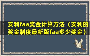 安利的奖金制度中有一个概念叫做“FAA”(Founders Crown Ambassador),这是安利奖励计划中的一个高级成就级别。达到FAA级别的销售代表通常会获得额外的奖金和奖励,但具体的奖金数额会根据个人的业绩、团队规模、销售量以及安利公司的政策而有所不同。
