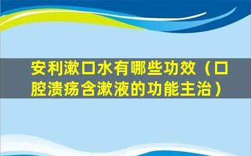 安利(Amway)是一个国际知名的直销公司,其产品线涵盖了多个领域,包括个人护理、家居清洁、营养补充品等。在个人护理产品中,安利也提供了漱口水产品,通常这类产品具有以下几种功效: