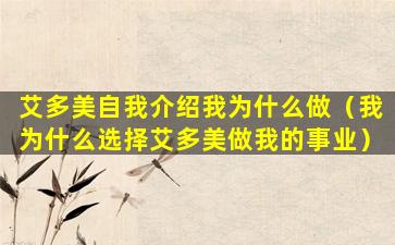 艾多美(Adomy)可能是一个品牌、公司或者产品,但由于信息不足,我无法提供具体的自我介绍。如果您是在询问为什么某人或某公司选择做艾多美相关的工作或业务,这通常会涉及个人的职业选择、公司的商业策略或者产品的市场需求。以下是一些可能的原因:
