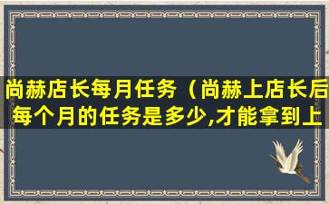 关于尚赫上店长后每个月的任务量以及如何达到上万工资的问题,这通常取决于多个因素,包括但不限于店铺的规模、地理位置、销售目标、以及公司的具体政策。一般来说,店长的工资可能包括基本工资加上业绩提成或奖金。
