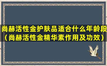 尚赫活性金护肤品是一款注重抗衰老和肌肤修复的护肤产品。通常,这类产品适合25岁及以上的人群使用,因为这个年龄段的人群肌肤开始出现初老迹象,如细纹、干燥和失去弹性等。尚赫活性金护肤品中的活性金成分可以帮助提升肌肤的紧致度和光泽,促进肌肤的自我修复能力。