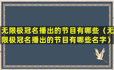无限极是一家中国的健康产品公司,它可能会通过冠名播出的方式来推广其品牌和产品。具体的节目名称会随着时间和地区的不同而变化,而且这些信息可能不会被广泛报道。如果您想了解无限极冠名播出的节目,建议直接访问无限极的官方网站或关注其官方社交媒体账号,以获取最新的营销活动和合作伙伴信息。您也可以查看电视台或网络平台的节目列表,看是否有无限极冠名的节目。请注意,我的知识截止日期是2023年4月,因此我无法提供此日期之后的最新信息。