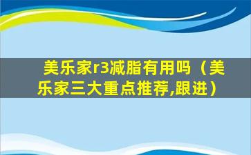 美乐家(Meilejia)是一个提供健康食品和营养补充品的品牌,而R3可能是指其某一系列的产品。关于“美乐家R3减脂有用吗”这个问题,需要从几个方面来考虑: