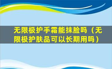 无限极护手霜主要是为手部肌肤设计的,其成分和质地可能与面部护肤品有所不同。虽然护手霜在紧急情况下可以用于面部,但不建议长期或频繁使用。面部肌肤通常比手部肌肤更敏感和细腻,因此需要使用专门为面部设计的护肤品。