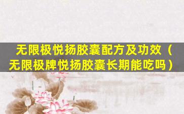 如果您想了解“无限极悦扬胶囊”的具体配方和功效,建议直接咨询无限极公司或查看产品包装上的说明。在中国,所有保健品都需要通过国家食品药品监督管理局的审批,并在包装上明确标注成分、功效、使用方法和注意事项等信息。