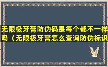 无限极牙膏的防伪码通常是每个产品都不一样的。防伪码是生产商为了防止假冒伪劣产品流入市场,保护消费者权益而采取的一种措施。每个防伪码都是唯一的,就像一个产品的身份证号码,消费者可以通过查询这个防伪码来验证产品的真伪。