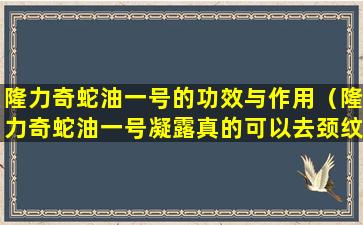 隆力奇蛇油一号凝露是隆力奇公司生产的一款护肤产品,它含有蛇油成分,据称可以帮助滋润皮肤,改善皮肤干燥等问题。关于去颈纹的效果,这通常取决于颈纹的类型和形成原因。