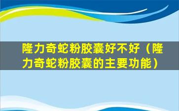 隆力奇蛇粉胶囊是一种在中国市场上销售的保健品,它主要成分是蛇粉,据称具有一定的保健功效,如增强免疫力、改善血液循环等。对于这类产品的效果,科学证据往往有限,而且每个人的体质和反应都不同,因此很难一概而论地说它好不好。