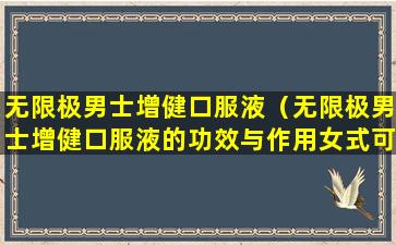 关于“无限极男士增健口服液”,这可能是该公司针对男性消费者推出的一款保健品。通常这类产品会宣称能够帮助男性增强体力、提高免疫力、改善身体机能等。需要注意的是,保健品的效果因人而异,且在中国,保健品的宣传受到严格监管,不能宣称具有治疗疾病的功能。
