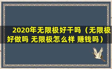截至我的知识更新日期(2023年),关于“2020年无限极好干吗”的问题,我无法提供具体的个人经验或评价,因为这需要基于个人的具体情况和市场环境。无限极是一家以中草药健康产品为主的公司,其业务模式包括直销。在2020年,由于全球新冠疫情的影响,很多行业都受到了冲击,包括直销行业。
