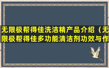 无限极(Infinitus)是一家中国的健康产品公司,其产品线涵盖了个人护理、家居清洁等多个领域。关于“帮得佳多功能清洁剂”的功效与作用,以下是一些可能的信息,但请注意,这些信息可能需要通过官方渠道或产品说明书来验证: