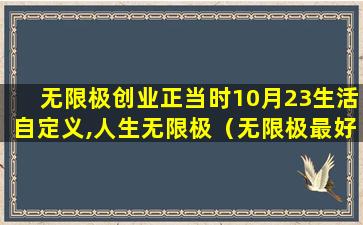 这句话似乎是在宣传或推广某个品牌或产品,其中“无限极”可能是一个品牌名称,而“创业正当时”和“生活自定义,人生无限极”则是宣传口号或理念。这样的口号通常旨在激励人们追求自己的梦想,通过创业或选择某种生活方式来实现个人价值。