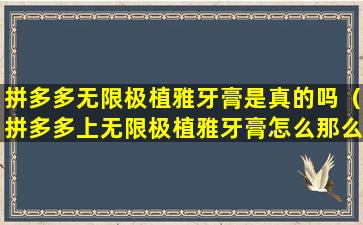 拼多多是中国的一个大型电商平台,上面有很多商家销售各种商品,包括无限极植雅牙膏。在拼多多上购买商品时,建议您仔细查看商品的详细信息,包括商家的信誉评价、商品的评价和销量等,以判断商品的真伪。