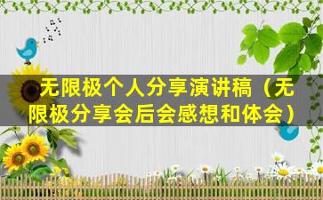 无限极是一家中国的直销公司,主要销售健康产品。分享会通常是公司为了推广其产品和服务,吸引新客户和招募新成员而举办的活动。在分享会上,公司可能会邀请现有的成员分享他们的成功故事,产品的使用体验,以及加入公司后的个人成长和变化。