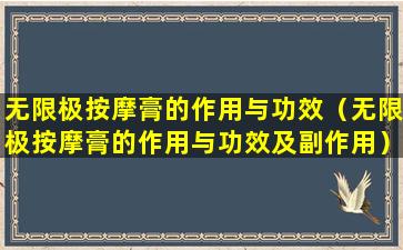 无限极是中国的一个品牌,它生产多种健康和美容产品,包括按摩膏。按摩膏通常用于缓解肌肉疼痛、促进血液循环和放松肌肉。以下是按摩膏可能的作用与功效: