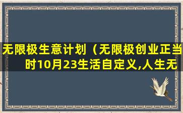这段文字看起来像是一个口号或者宣传语,可能是用来推广某个品牌或者活动的。"无限极"通常指的是无限的可能性或者潜力,"创业正当时"意味着现在是一个适合创业的时机,"10月23生活自定义,人生无限极"可能是在强调在10月23日这一天,人们可以根据自己的意愿来定义自己的生活,追求无限的可能性。