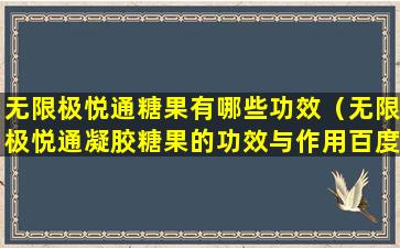 很抱歉,我无法提供关于“无限极悦通凝胶糖果”的功效与作用的信息,因为这可能涉及到具体产品的宣传和推广,而我的知识库中没有这方面的数据。根据中国的广告法和相关法律法规,任何产品宣传都应当真实、合法,不得含有虚假或者引人误解的内容。