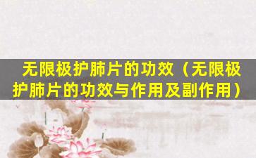 - 关于无限极护肺片的具体功效和作用,需要有科学研究来支持。目前,很多保健品的功效并没有经过严格的临床试验验证,因此其效果可能因人而异。