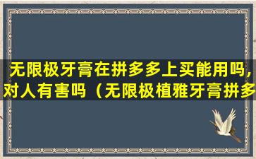 如果购买的是正品无限极牙膏,并且按照说明书正确使用,通常不会对人体造成伤害。但如果购买到假冒伪劣产品,由于其成分不明,可能会对口腔健康造成影响。因此,购买时一定要谨慎,确保来源可靠。如果对产品有疑问,可以咨询无限极官方客服。