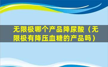 无限极(Infinitus)是一家中国的保健品公司,提供多种健康产品。关于降尿酸的产品,无限极可能会有一些产品声称可以帮助调节尿酸水平,但具体产品的效果需要根据个人的体质和实际情况来判断。