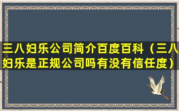 截至我所知的信息更新日期(2023年),关于“三八妇乐公司”的具体信息在百度百科上并没有详细的条目。这可能是因为该公司不是一个广为人知的企业,或者它的信息没有被广泛收录在公共数据库中。