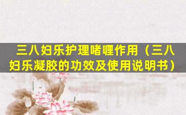 关于“三八妇乐凝胶”的功效及使用说明书,由于我无法访问最新的数据库,因此无法提供具体的产品信息。通常,这类产品可能是针对女性私密部位的护理产品,可能包含抗菌、消炎、止痒等功效。使用说明书通常会包含产品的使用方法、注意事项、适用人群和可能的副作用等信息。