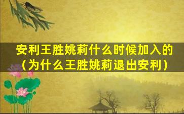 截至我的知识更新日期(2023年),我无法提供关于个人王胜和姚莉加入安利的具体时间信息,因为这属于个人隐私范畴,且没有公开的详细记录。安利(Amway)是一家全球知名的直销公司,成立于1959年,总部位于美国密歇根州。如果王胜和姚莉是安利的直销商,他们可能是在不同的时间点加入的,这通常取决于他们个人的决定和时机。