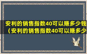 关于“安利的销售指数40可以赚多少钱”的问题,首先需要澄清的是,安利(Amway)是一家全球知名的直销公司,其销售模式涉及个人销售和团队建设。安利的收入结构通常包括个人销售利润、团队业绩奖金以及其他可能的奖励。