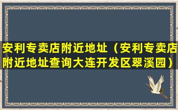 安利(Amway)是一家全球知名的直销公司,提供各种健康、美容和家居产品。如果您想要查询大连开发区翠溪园附近的安利专卖店地址,可以通过以下几种方式进行查找: