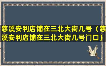 截至我的知识更新日期在2023年,关于“慈溪安利店铺在三北大街几号楼”的具体信息,我无法提供确切的地址。安利(Amway)是一家全球知名的直销公司,其店铺地址可能会随时间变化,或者在不同地区有所不同。