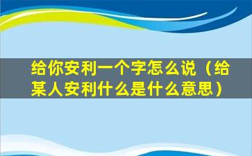 在中文里,“给你安利一个字”通常是指推荐或介绍一个字,希望对方了解或使用。如果你想要用更正式或书面语的方式表达这个意思,可以说: