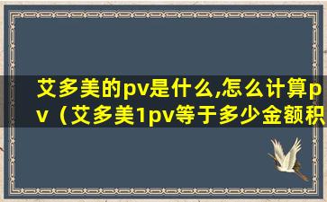 "PV"在艾多美的语境中可能指的是"Personal Volume",这是直销行业中的一个术语,用来衡量一个直销商或其团队在一定时间内销售的产品数量。在直销公司中,直销商通常需要达到一定的PV值来维持其级别或获得奖金。PV通常与销售额直接相关,但有时也可能包括其他因素,如团队业绩等。