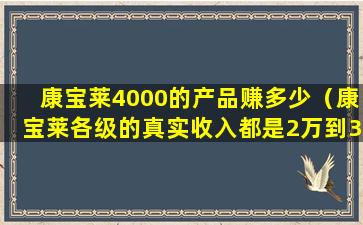 由于康宝莱的收益结构复杂,且每个人的销售能力和市场情况不同,很难给出一个具体的数字来回答“康宝莱4000的产品赚多少”。如果你想了解更多关于康宝莱的收益细节,建议直接咨询康宝莱公司或其官方分销商,并仔细阅读相关的收益计划和合同条款。同时,也要注意,参与多层次营销需要谨慎,确保了解所有潜在的风险和收益。