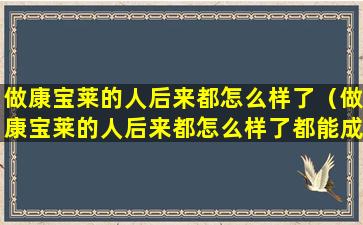 由于每个人的情况不同,没有统一的答案可以描述所有“做康宝莱的人后来都怎么样了”。如果你对康宝莱或直销行业感兴趣,建议你进行充分的研究,了解公司的历史、产品、市场情况以及加入直销可能面临的风险和挑战。同时,也可以咨询现有的康宝莱经销商,了解他们的个人经验和建议。