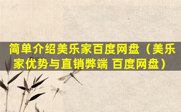 关于“百度网盘”,这似乎与美乐家或直销模式没有直接关联。百度网盘是百度公司提供的一项云存储服务,用户可以在其中存储和分享文件。如果您有关于百度网盘的具体问题,请提供更多信息,以便我能提供更准确的回答。