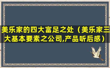 美乐家(Melaleuca)是一家美国的直销公司,成立于1985年,主要销售健康、个人护理、家庭清洁和营养补充品等产品。美乐家强调其产品的环保和健康理念,并通过其会员制度进行销售。关于“美乐家的四大富足之处”,这可能是指美乐家在其营销材料中提到的四个方面的优势或特点,但具体内容可能因时间和地区而异。